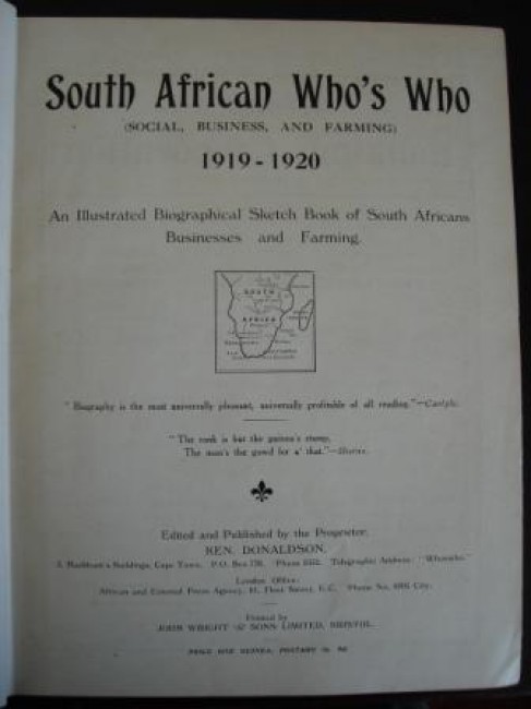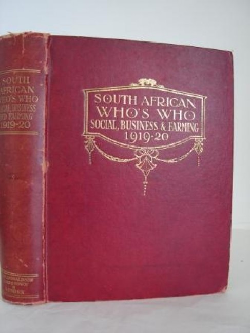 This work of Reference is published only once every 2 years. An illustrated biographical sketch book of South Africans, businesses and Farming. This issue inaugurates the Farming Section. Biographies include photographs of most of the entries, plus a paragraph of biographical details. Business entries show premises, farming section shows animals and produce. Many advertisements, including on the endpapers.