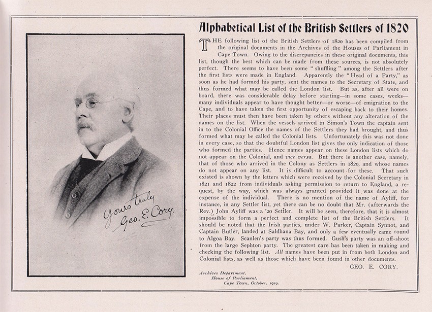 Contains an alphabetical list of the British Settlers (pages 95-116) compiled by George Cory.