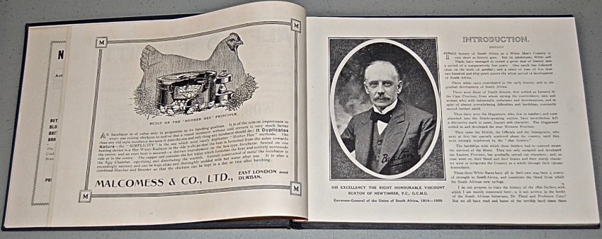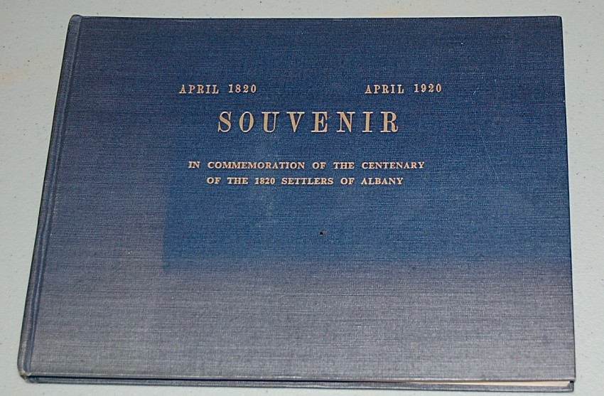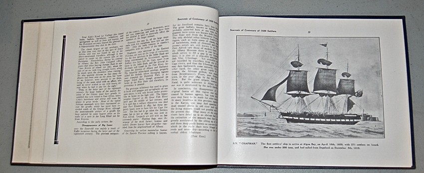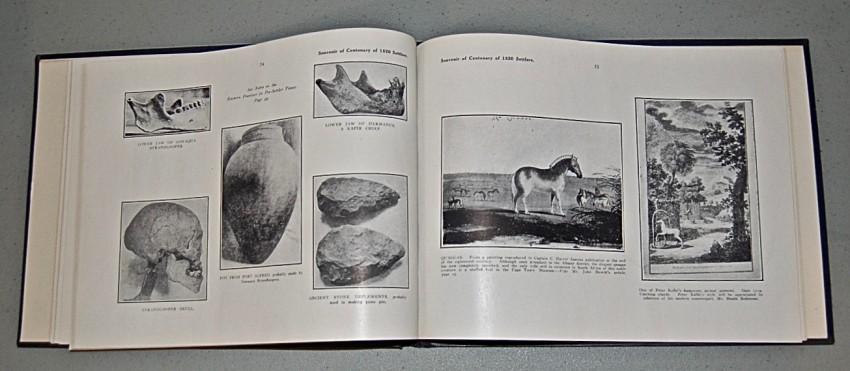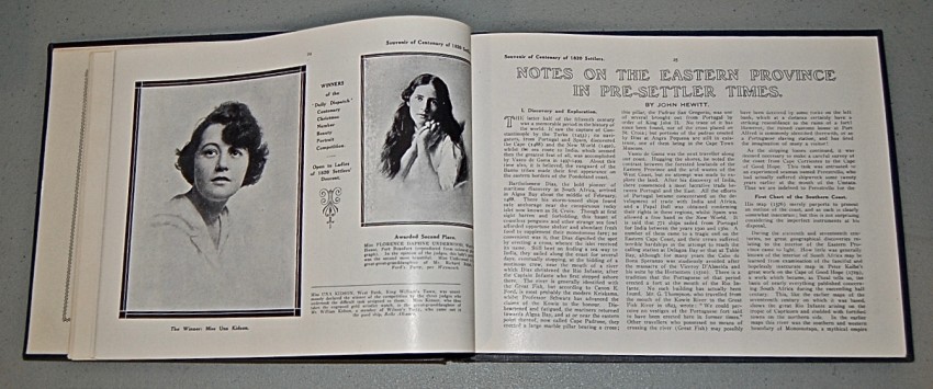 Cape Town: Daily Dispatch, 1920. First edition (pp. 124, with many additional pages of adverts fore and aft). Small long folio (25 cm) in publisher’s blue cloth, gilt titles; illustrated with many modern and vintage photographs, sketches (e.g., Port Elizabeth). List of original Albany settlers of 1820, pictures and sketches of noteworthy individuals (winners of Daily Dispatch beauty contest, governors-general). Cover somewhat sun-faded in places, pictures bright and jocund, occasionally flatulent text pulled away from staples at rear; a very good, clean copy soon to be superseded by the 2020 edition.