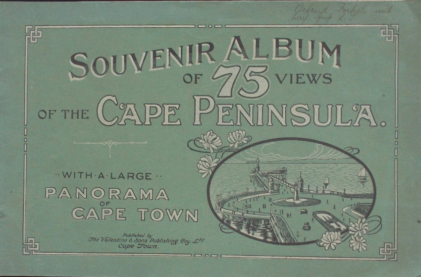 18pp with 75 sepia views of the Cape Peninsula with a large panorama of Cape Town. Very good to very good (+) publisher’s original dark green cloth covers with titles in black and silver on the front cover. Light cream in the bottom right hand corner of the front cover and a few of the following pages.