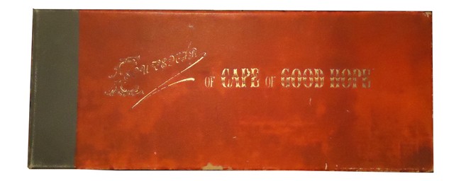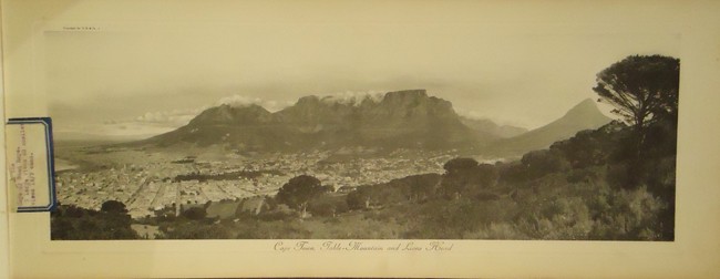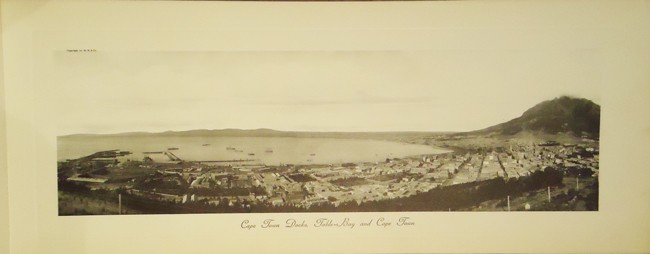 Large oblong album, 220 x 560 mm, 26 well printed photographic plates including 11 fine panoramas each measuring 175 x 500 millimetres. The 15 other plates each have 4 photographs measuring 120 x 175 millimetres. All the photographs are printed within embossed borders and with brief captions. There in an introductory leaf of text describing Cape Town - \'The Gateway to South Africa\' with a poem on the verso. Other leaves of text describe Simonstown, Port Elizabeth, East London and Kimberley. Bound in cloth - green at the spine and with sides in red, titled in gilt on the upper cover.