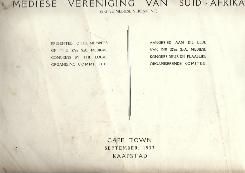 27TH SOUTH AFRICA MEDICAL CONGRESS,CAPETOWN 1933. RARE. 1st Edition. Very good but worn pictorial card covers. Contents fine with mild soiling. 35 black and white and sepia photos. Oblong size. Rope tie.