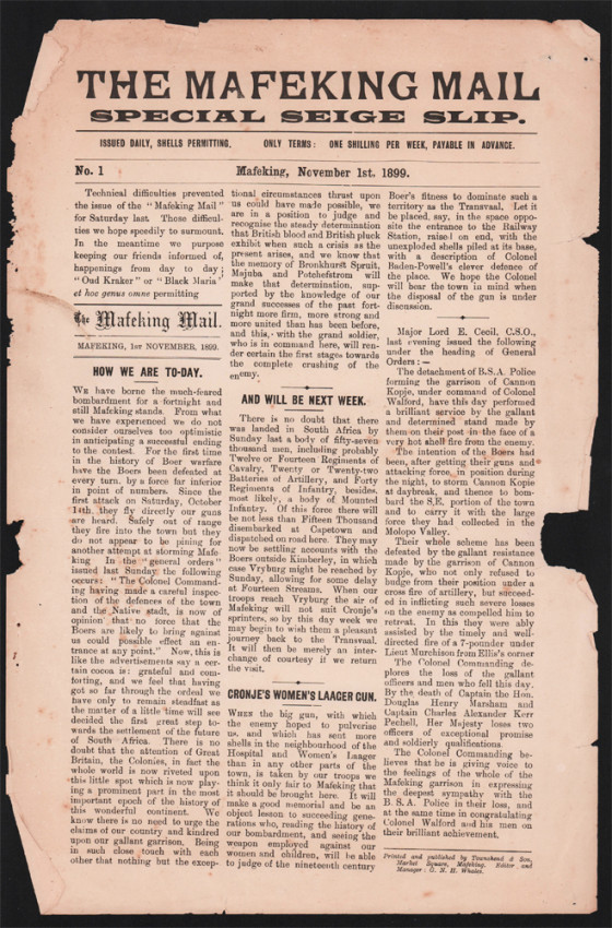 In a recent article Dr Robin Pelteret has published the results of his research into the publication of the Siege Slips. 'In Mafeking, there was to exist a fragile peace between the publisher and editor of the Mafeking Mail Special Siege Slip, G.N.H. Whales, and the military authorities. Whales was somewhat acerbic of tongue. He once publicly thanked the press censor for saving his life, a Boer shell having destroyed his editorial chair whilst he was submitting his newspaper copy for military scrutiny elsewhere in the village. He was to be briefly imprisoned on one occasion for publishing querulous criticism on the conduct of the siege and the restrictions on the availability of news. In protest, he was known to publish empty columns (No. 47) and indeed cancelled one whole edition (No.45) as visible disregard and mute testimony to the censor's liberal use of a blue pencil.' Discussing entrepreneurship and the siege of Mafeking he writes, ‘Equally the spirit of entrepreurship was manifest in the publication of The Mafeking Mail: Special Siege Slip under the management and editorship of G.N.H. Whales. Townsend and Whale clearly perceived the curiosity value of their publication, and printer and editor proceeded to create a business of what was initially a community service.