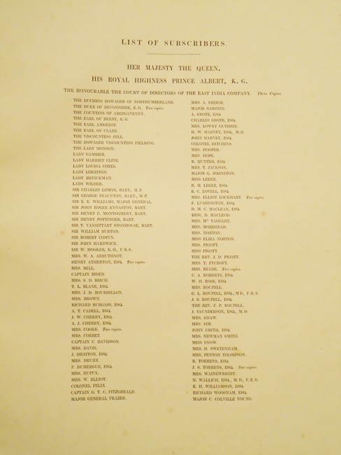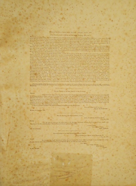 It also includes acknowledgements from the President of the Royal Botanical Society of Germany, the Secretary of the Royal Institution, London and the President of the Royal Horticultural Society of England thanking Mrs Roupell for copies she donated to these institutions. It is unknown why this sheet was printed (it is on poor quality paper and is heavily foxed) but it confirms that the edition of was larger, if only be a few copies, than the 110 derived from the names printed in the list of subscribers.