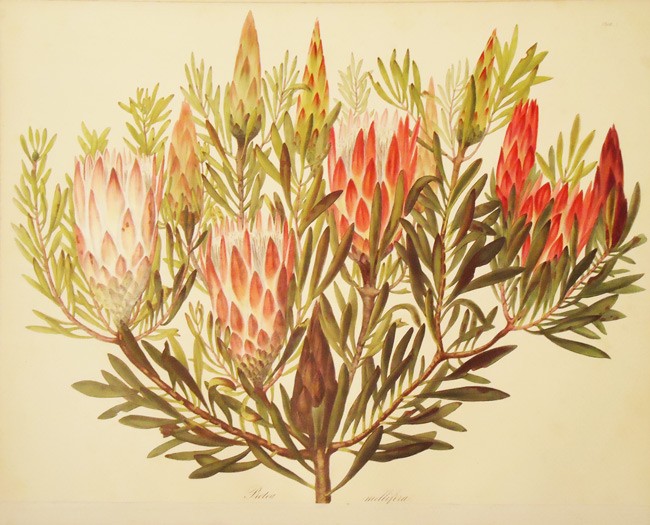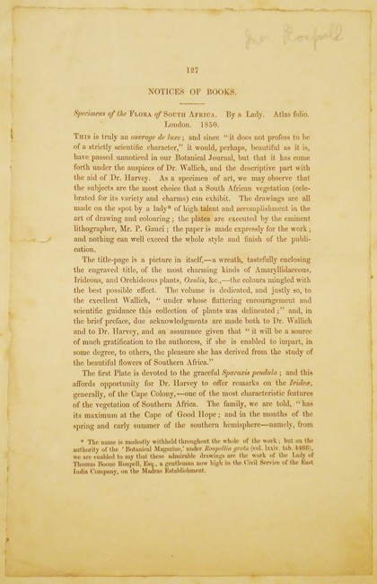 A printed leaf bound in at the end of this copy reproduces a detailed description of the album from Hooker’s Journal of Botany and New Garden Miscellany, April 1850. A footnote states,’The name is modestly withheld throughout the whole of the work; but on the authority of the ‘Botanical Magazine,’ under Roupella grata (vol. lxxxiv, tab. 4466) we are enabled to say that these admirable drawings are the work of the Lady of Thomas Boone Roupell, Esq., a gentleman now in high service in the Civil Service of the East India Company, on the Madras Establishment.’