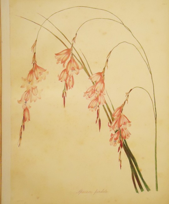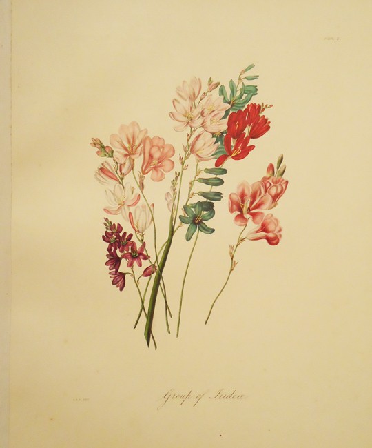 Original light brown cloth, titled gilt on the upper cover within a gilt floral surround, gilt decorated borders which are repeated on the back in blind, new leather spine and corners. The plates and text which are printed on special paper have been mounted album-style with linen hinges – one slightly obscures the caption of the plate (the original binding was made with gutta-percha – a latex solution derived from the Palaquium tree – which over time dries and cracks. Almost all books bound in this way in the 19th century now need the attention of a bookbinder), the first plate, Sparaxis Pendula, is lightly foxed, the other plates are clean and bright (the guard leaves are lightly foxed).