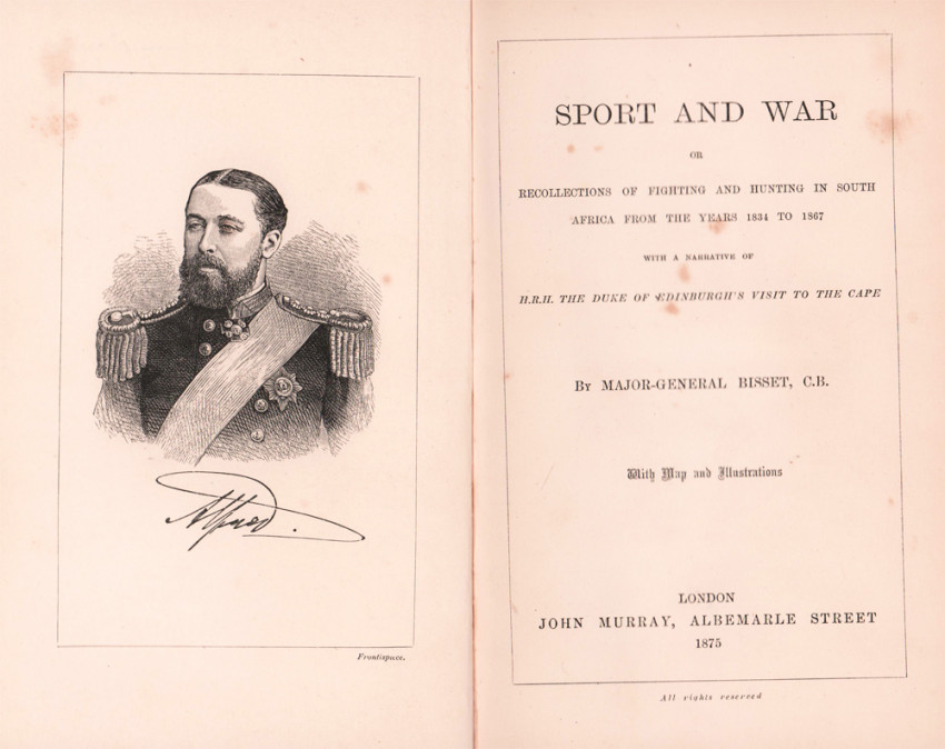 Mendelssohn (Sidney) South African Bibliography volume 1 page 128: Bisset joined the Bathurst volunteers as a boy of fifteen, on the proclamation of martial law, during the Kaffir War of 1834-5, and he soon received a commission, and gradually rose to high rank. A full account is given of the operations which led to the annexation of British Kaffraria and the surrender of Sandilli. There is a description of the visit of Prince Alfred to South Africa in i860, the author accompanying the Prince throughout his tour, and also on his second visit in 1867. General Bisset was appointed Lieut.-Governor of Natal in 1865. The volume concludes with some chapters on South African legends, and there are maps of S. E. Africa and British Kaffraria.