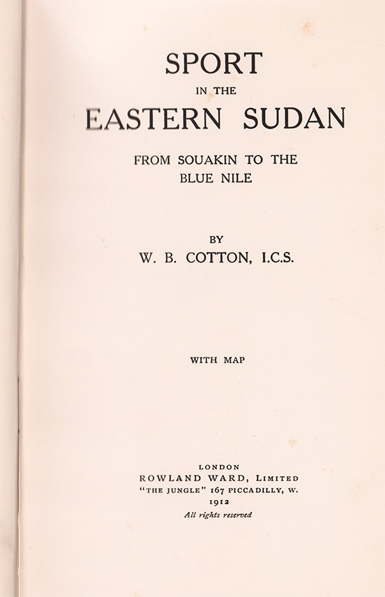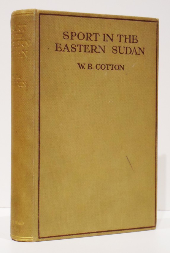 Czech (Dr. Kenneth) An Annotated Bibliography of African Big Game Hunting Books 1785-1999 page 67: A rather scarce Rowland Ward publication, the first issue was published with a map and map pocket, while the second issue apparently lacked both. This work details the author's 1910 -11 expedition on which he bagged gazelle, leopard and hippo near the Atbara River. Continuing on to the Setit, he shot lion, buffalo, kudu and other plains game, some from a machan near a watering hoel. Cotton then trekked to the Rahad and Dinder Rivers where he collected lion, buffalo, hippo and a variey of plains game, The nine month safari cost Cotton 750 Pounds.