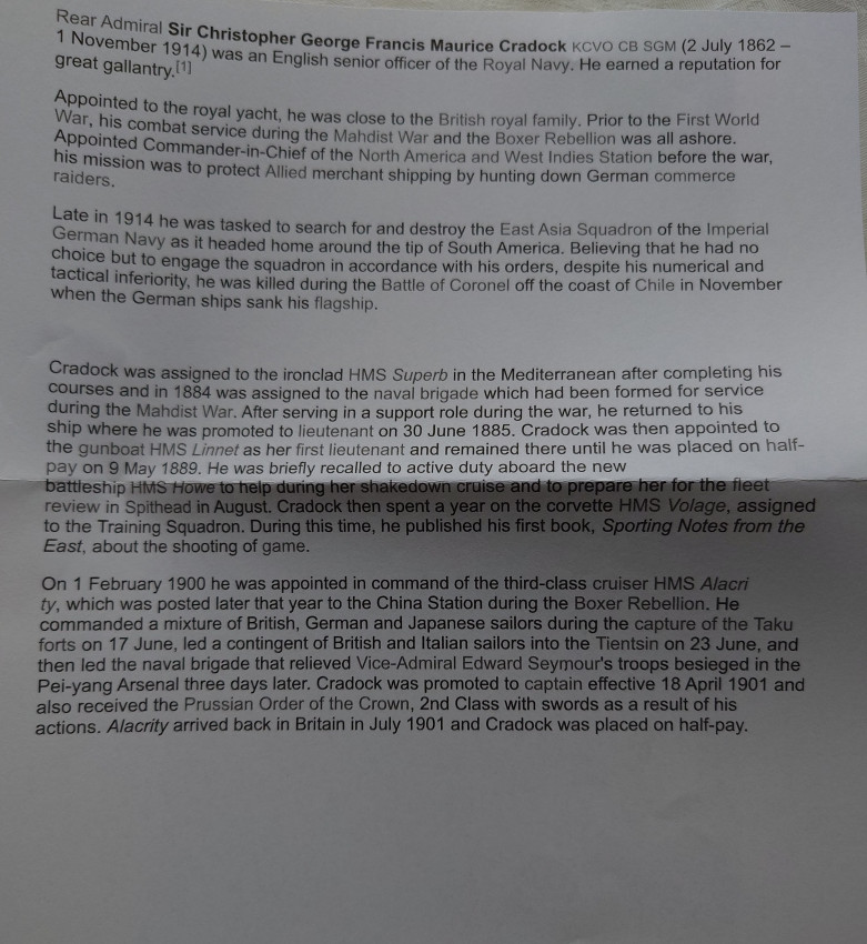 Late in 1914 he was tasked to search for and destroy the East Asia Squadron of the Imperial German Navy as it headed home around the tip of South America. Believing that he had no choice but to engage the squadron in accordance with his orders, despite his numerical and tactical inferiority, he was killed during the Battle of Coronel off the coast of Chile in November when the German ships sank his flagship. (https://en.wikipedia.org/wiki)