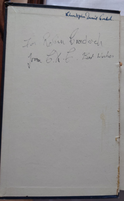 Signed in ink by the author on the front pastedown. Also inscribed to Robin Cradock on the front pastedown. With embossed library stamp of Christopher Cradock.