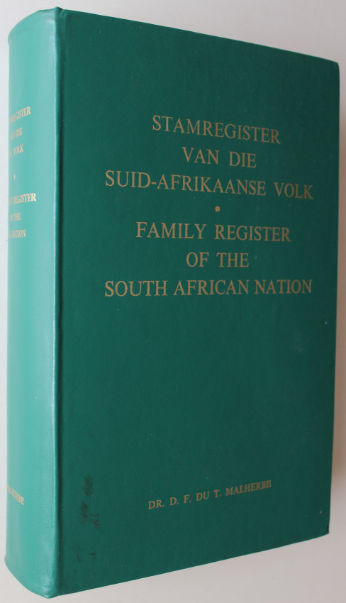 A comprehensive and detailed summary of the family register of the South African Nation. 1208 pages. Tape marks on end papers. Clean and without any ink or pencil inscriptions or markings. A good copy. In Afrikaans and English.