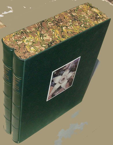 Housed in the original hand made dark green cloth covered slip case with marbled paper and leather trim and a pictorial inset on the upper side.