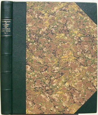 Original hand crafted bindings by master craftsman Peter Carstens with dark green leather, gilt titling on the spines and hand marbled paper on the boards.