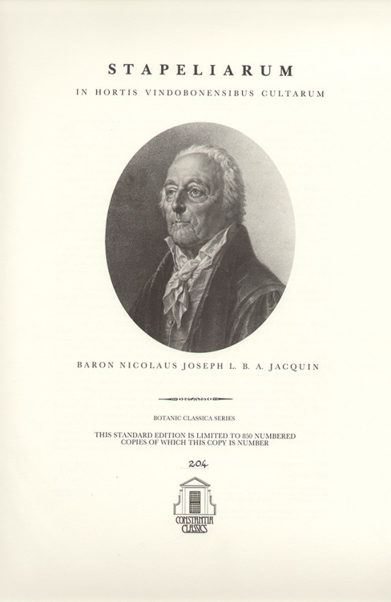 Stapeliarum in Hortis Vindobonensibus Cultarum' (Descriptions of the Stapelieae cultivated in the Botanical Gardens of the Schoenbrunn Palace of Vienna) by the celebrated Austrian botanist Baron Nicolaus Joseph van Jacquin is one of the great works of botanical Africana. A useful feature of this new edition is the inclusion at the end of the volume of an up-to-date nomenclature revision of the species in the book.