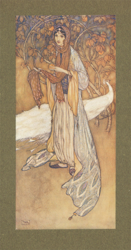 Books produced under this arrangement by Dulac include Stories from The Arabian Nights (1907) with 50 colour images; an edition of William Shakespeare's The Tempest (1908) with 40 colour illustrations; The Rubaiyat of Omar Khayyam (1909) with 20 colour images; The Sleeping Beauty and Other Fairy Tales (1910); Stories from Hans Christian Andersen (1911); The Bells and Other Poems by Edgar Allan Poe (1912) with 28 colour images and many monotone illustrations; and Princess Badoura (1913). https://en.wikipedia.org/wiki/Edmund_Dulac