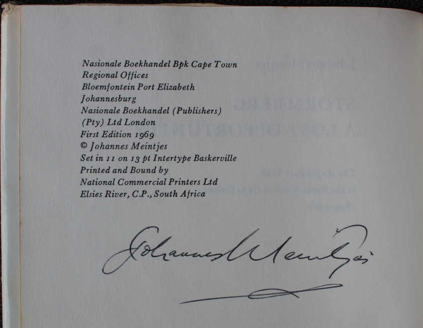 Black covers with the title to the spine. 206 pages. The dust jacket has wear around spine edges. Bookshop stamp on ffep. Signed by Meintjes.