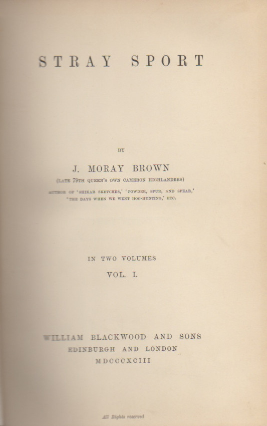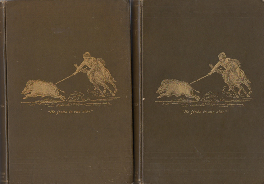 In this extensive work combining the author's sporting adventures in India, Ceylon, and Britain, he includes a long chapter on tiger shooting with details a hunt near Hyderabad and includes chapter on measuring the tiger. While in the Sewalik Hills of the Dehra Doon, he hunted chital, shot small game near Delhi and relates numerous pig sticking episodes. He also includes shooting waterfowl and game birds in England, and trout angling. 2 volumes in the original dark olive cloth with bright gilt spine titles and bright gilt pigsticking vignettes to the top covers. Corners bumped. Original dark burgundy endpapers. Illustrated with full page plates and numerous text drawings. A tight, clean, and attractive set.