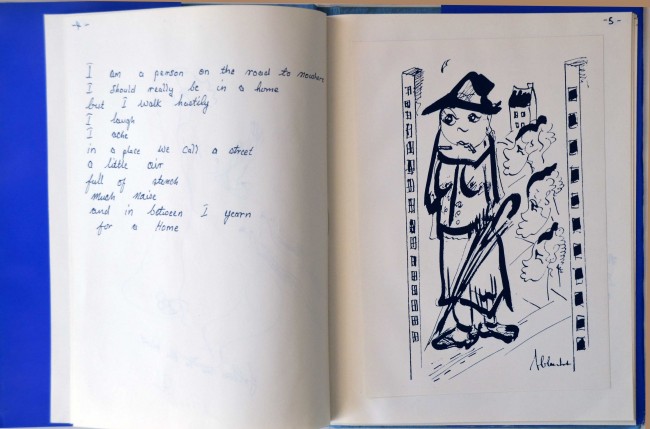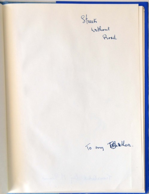 This is an interesting hand produced book, the story of which is still uncertain. A copy sold on this site(for $2000) was thought to be a one off and unique. However, I have seen several copies of both the English and Afrikaans versions (Strate Sonder Pad). This English version is translated by M.Pienaar. Each copy has handwritten poetry accompanied by 12 tipped in Claerhout graphics or prints. The handwritten poetry is in different hands in the few copies I have inspected. Some copies have original Claerhout drawings on the prelims. This copy has two original ink drawings and is 28pp. The title and dedication pages inscribed in the artist's hand. It is hand bound in book cloth and has the original hand produced dw. (which is always the Afrikaans version ie. Strate Sonder Pad). My belief is that this book was produced by Claerhout as a school or mission project and that the text (in different hands) was written by the pupils. I do not think that there could have been more than 20 or 30 copies produced and it remains a scarce Claerhout item. About fine in a near fine dw. which has a 15mm. closed tear at the top of the front panel. An inexpensive printed version (in larger format in wrappers) was published by Claerhout at a later date. The two should not be confused.