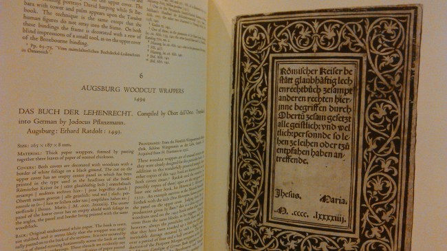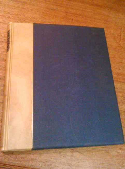 Small folio, 252 pages. Quarter vellum binding gilt on spine, with top edges gilt, blue cloth boards. Only 300 copies printed by Brooke Crutchley at the Cambridge University Press. Collotype reproductions by Van Leer of Amsterdam. This comprehensive survey of 8 centuries of bookbinding has as its source the celebrated Broxbourne Library, with additional items from dealers and the British Museum. The 119 examples are fully annotated and beautifully illustrated and include several in full colour. Some foxing on end papers and title page, but still a very good copy.