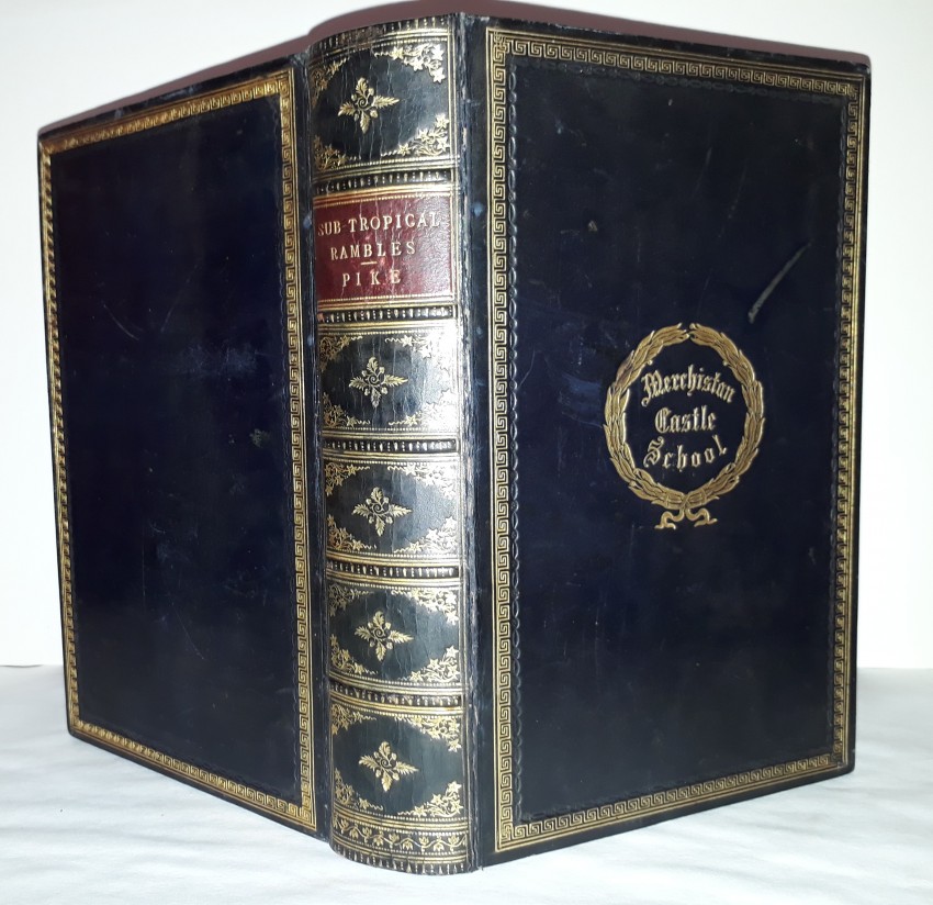 Pp. xviii, 509, (3) + adv 12. Four folding coloured maps, 15 full page plates (wood engravings)and further illustrations in the text - all present. Handsomely bound for presentation to pupil at Merchiston Castle School (in 1881). Full leather with gilt decorated boards and ribbed spine with 5 gilt-decorated panels and one label; marbled pastedowns. A very few pages have mild water stains but otherwise a clean copy with minimal foxing.