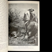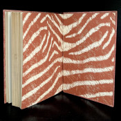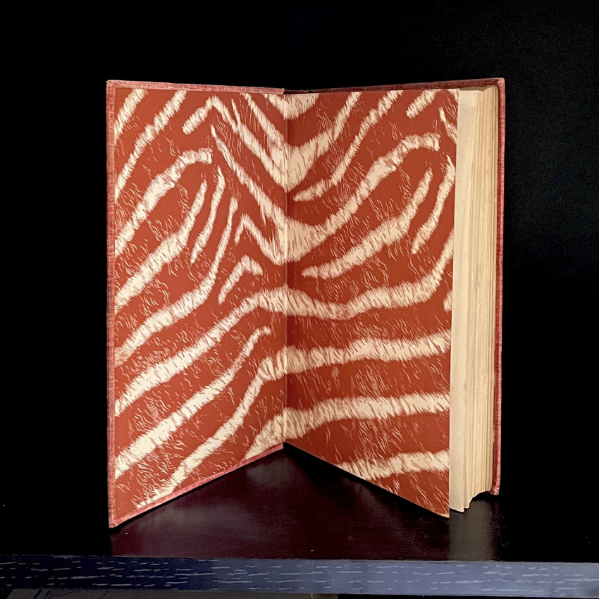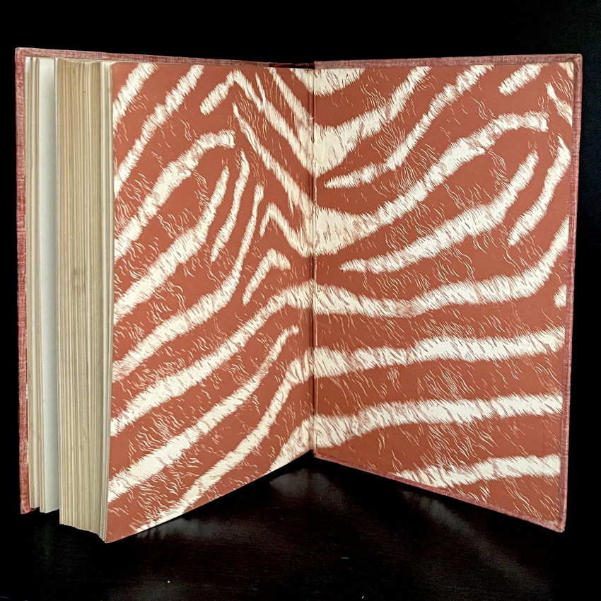 This copy published in 1896, the same year as the first printings, which are bound in khaki cloth, most copies of which are found today badly stained, discolored, aged, and the spines of those copies are most often darkened to an ugly dark brown. The first printings have black zebra pattern endsheets, whereas this copy has reddish. I think this copy is striking for its reddish endsheets as well as its reddish cloth. Certainly this copy's variant binding is far more uncommon than the khaki cloth.