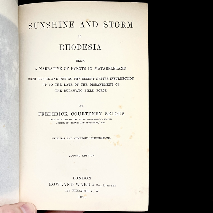 *SELOUS, FREDERICK COURTENEY : Sunshine and Storm in Rhodesia. Being a narrative of events in Matabeleland both before and during the recent native insurrection up to the date