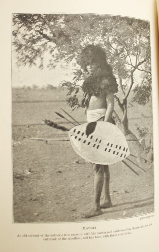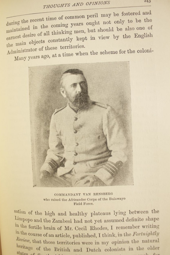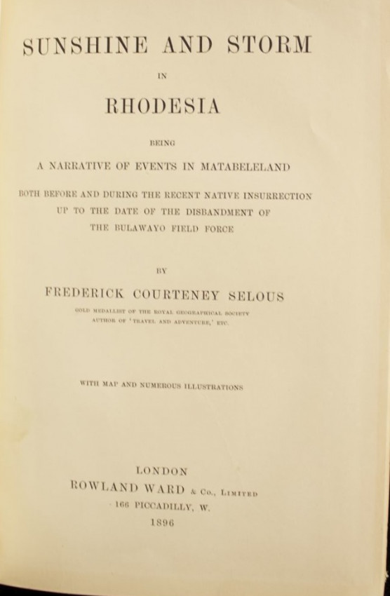 'After the close of the Matabele War, Mr. Selous returned to England, but in 1895 was offered an appointment in Matabeleland, and proceeding to Rhodesia, took up the management of the Essexvale Estate in the neighbourhood of Bulawayo. He was busied in the organization of the property till March 1896, when the rebellion of the natives broke out, and he assumed the command of the H troop of the Bulawayo Field Force, which he retained till the conclusion of hostilities. The author was of the opinion that the removal of the police force from Matabeleland to the Transvaal (Jameson Raid), "gave the natives their opportunity to revolt," but he asserts that the leaders of the insurrection had long determined on rising whenever the circumstances were favourable to the movement. The causes of the discontent amongst the natives were, the exaction of "a certain amount of paid-labour from every able-bodied man," the confiscation of cattle, and the endeavour on the part of the Matabeles to free themselves from the restraints of a settled form of government. In addition to a full account of the rebellion, there is a supplementary chapter recording some of the author's views on the Anglo-Boer question, in which he states that "a war between the Boers and British can only be a calamity of incalculable dimensions to both races." ' - Mendelssohn Vol.II, page 302