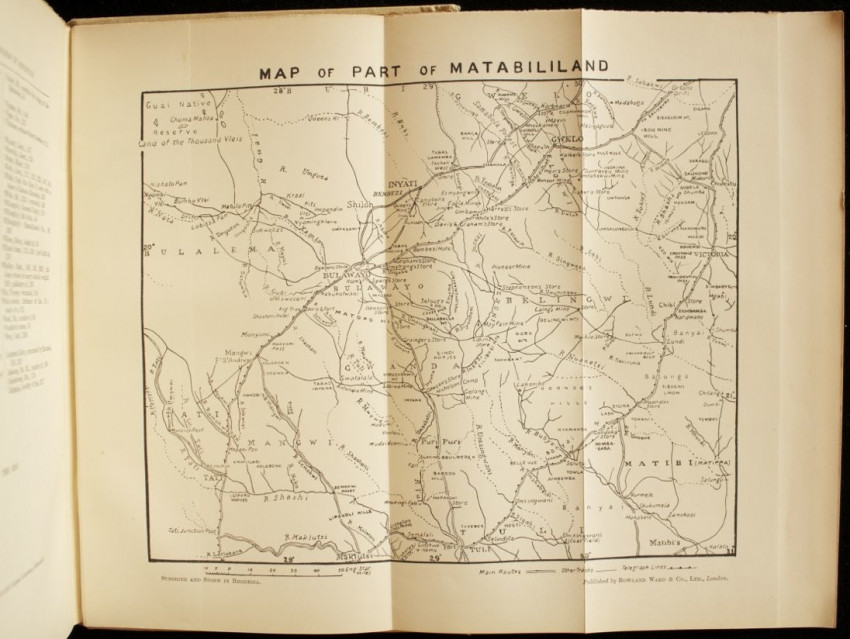 Publisher's cream coloured cloth binding with brown titles on front and Matabele shield and assegai design on spine. Zebra-skin patterned endpapers. Binding tight and square with clean panels (which are often found soiled). Top front corner bumped. Contents clean with no markings. All plates and map present. A very good copy.