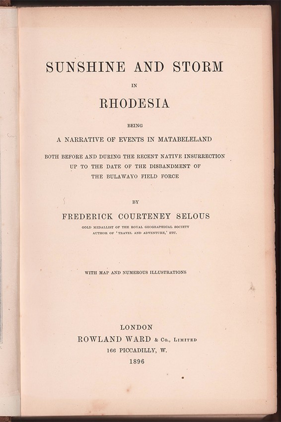 Mendelssohn (Sidney) South African Bibliography volume 2,page 302:After the close of the Matabele War, Mr. Selous returned to England, but in 1895 was offered an appointment in Matabeleland, and proceeding to Rhodesia, took up the management of the Essexvale Estate in the neighbourhood of Bulawayo. He was busied in the organisation of the property till March 1896, when the rebellion of the natives broke out, and he assumed the command of the H troop of the Bulawayo Field Force, which he retained till the conclusion of hostilities.