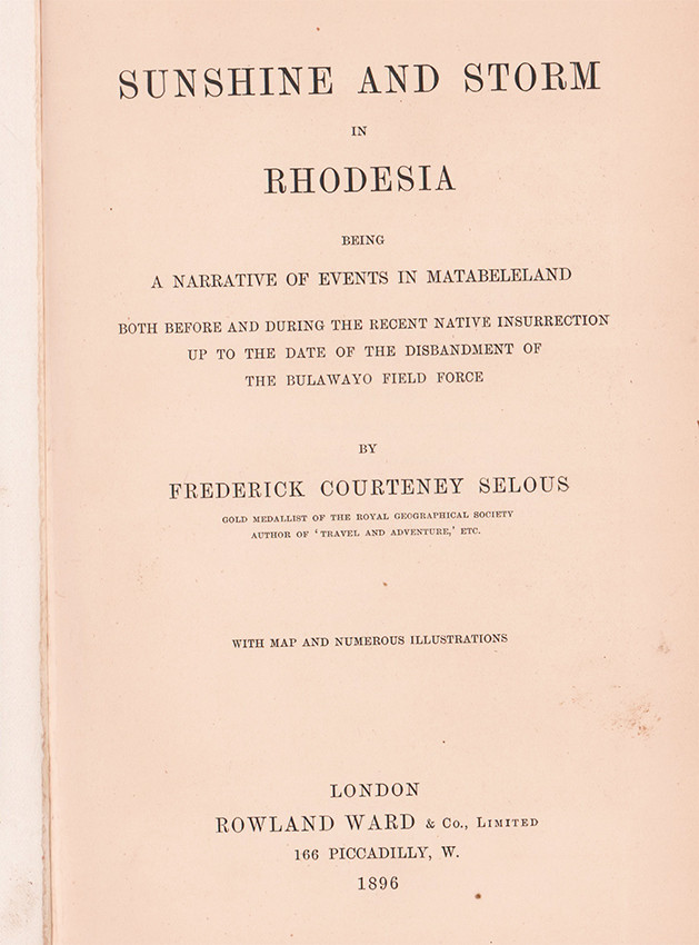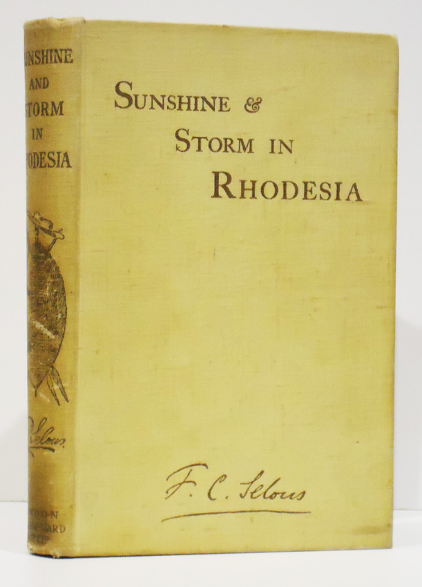 First Edition: 290 pages + 10 pages publisher's catalogue, frontispiece, folding map, 9 plates, 6 illustrations in the text, alternative binding of original cream buckram with title and decoration on the spine in brown, distinctive Rowland Ward black zebra skin patterned endpapers, a very good copy.