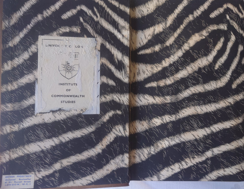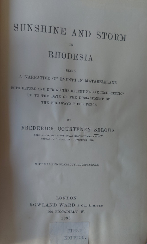 Published by London : Rowland Ward & Co., Limited, 1896. 1st Edition. xix, 290, [10]ads.pp. Original title-blocked pictorial cloth and zebra end papers. Buckram as usual is darkened to the front board and spine. Small split to the spine. Internally very good and solid. Black and white ills. With a folding map. Scarce first edition.