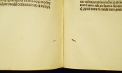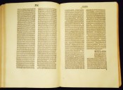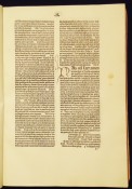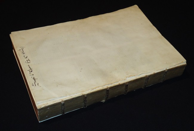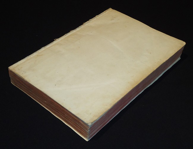 Unbound but sewn to bands, the first blank is separated and the final gathering is nearly detached, there are stains, ink perhaps, penetrating the page, at the bottom of leaves e4, f4, f(8), i4, i(6), k2-k(9), m3, n2,n3, o1, o(6)-o(8), o(10),p1,p2. There is a separate blot on the text of leaf and a spot on the lower margin of F1 verso. There is also some, generally faint, water staining evident in the pages of the Tabula and Register, it has not affected the text or the written notes. There is a single narrow wormhole present in the lower margins of folios A(10) to D5, well clear of the printed areas.The final leaf has a fragment torn from the upper corner possibly as the result of an attempted repair and the margin is discoloured. There are manuscript notations in margin of the tabula. There is a solitary attempt at a pen and ink decorative capital on leaf b2. Page edges dyed light red. Overall a crisp copy.