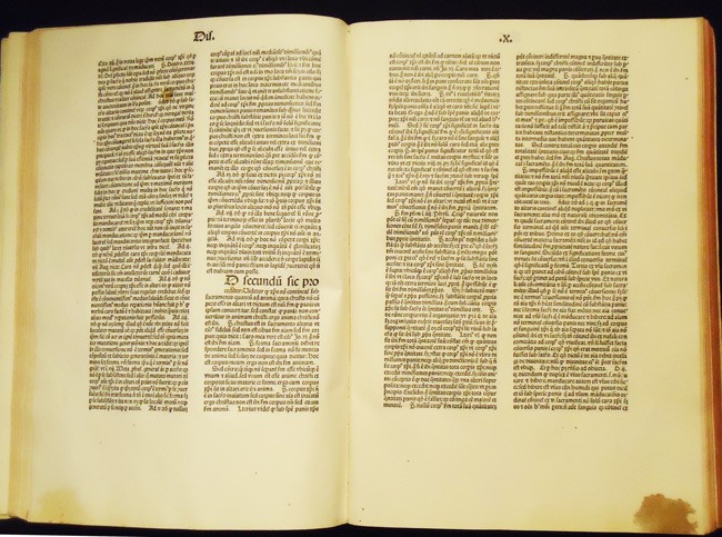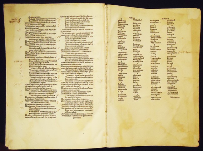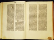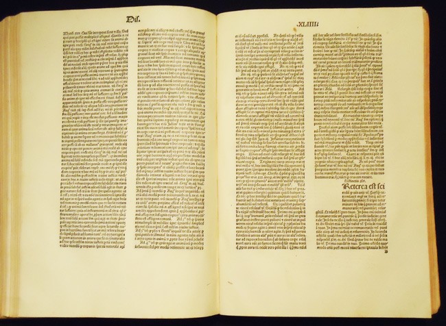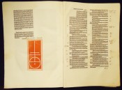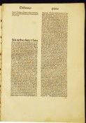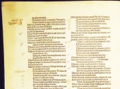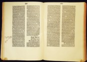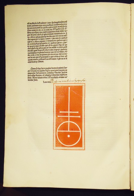 310 leaves including first blank with manuscript title, (a-z10, A-H10 (a1 blank, a2r text, H2v, printer's device printed in red, H3r tabula, H10r quire register, H10v blank), 56 lines and headline, double column, initial spaces, unrubricated, printed in two columns in gothic type.