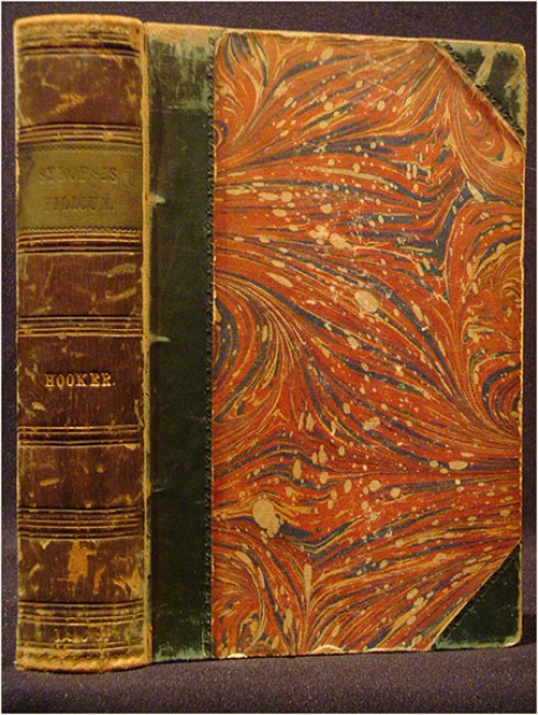 Half green leather and marbled paper sides - the leather and paper are very worn and the hinges are split so the case is loose, some pencil markings in the margins, otherwise the contents are good.