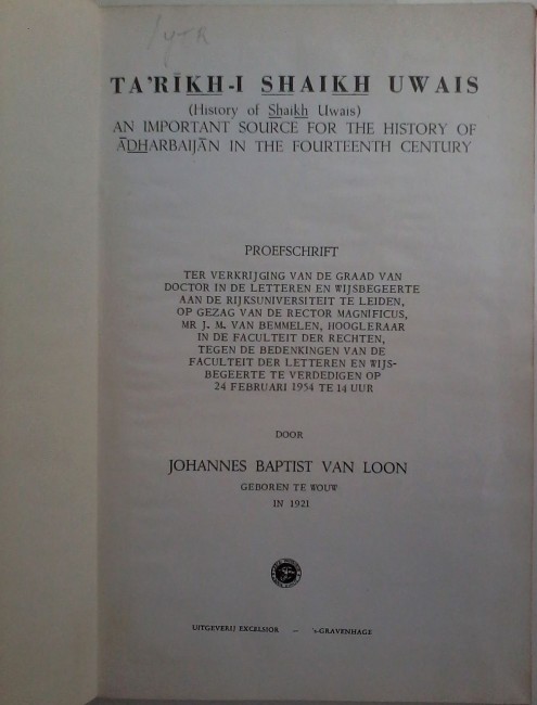 "Ta'rikh-i Shaikh Uwais: History of Shaikh Uwais. An important source for the history of Adharbaijan in the fourteenth century. Proefschrift ... door Johannes Baptist van Loon." [The Persian text of pp. 134-184 of "Ta'rik̲h̲-i S̲h̲aik̲h̲ Uwais" with an English translation, notes and a summary of pp. 1-134 by J. B. van Loon. With a foldout map of Adharbaijan and sorounding areas.]; Hardcovers; Collation complete - iv, 100 pages, 2 fold-out plates & 50 pages of persian text (thesis); Text in English + Persian text; Binding is tight and firm, spine a bit bumped to the top and bottom. Ex-owner's ink signature to the front free endpapers.