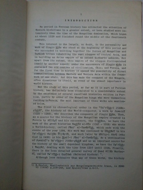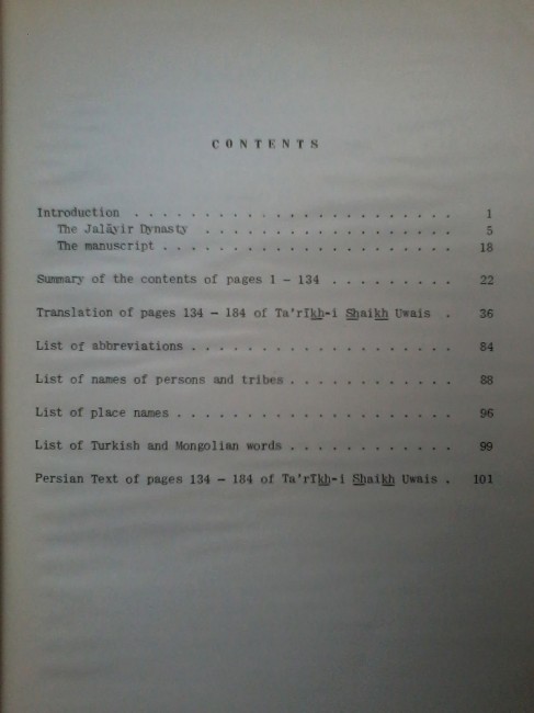 No period in Persian history has attracted the attentionof Western historians to a greater extent, or been studied more intensively than the time of the Mongolian domination, which began at about 1220 and finished round the middle of the 14th century. This interest is due largely to the personality and work of Genghis Khan who stood at the beginning of this period and who succeeded in knitting together the forces of Mongolian and Turkish tribes inhabiting the vast steppes of central Asia, and in building an Asian empire of an extent hitherto unknown. The study of this period, as far as it is part of Persian history, has definitely been stimulated to aconsiderable extent by the existence of several excellent histories written in Persian, partly by order of the Mongolian kings who were themselves residing in Persia. The history which is the subject of the present study, the Ta'rikh-i Shaikh Uwais, is one of the works of reference dealing with the decay of the Mongolian period in Persia, i.e. the first half of the 14th century. It owes its importance to its early origin, which we may put at the about 1360, and also to the fact that it deals especially with the history of one of the most important dynasties which became heir to part of the Mongolian empire, viz. the Jalayirs.