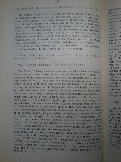This review of Ta'rikh-i Shaikh Uwais is based on the only manuscript of this work still extant, now preserved in the University Library in Leiden (Netherlands). The manuscript bears the mark of Levinus Warner and belonged to the "Legatum Warnerianum", the collection of oriental books and manuscripts beqeuathed by him to the library of the University of Leiden in 1665. It is bound in a brown leather cover with a flap, and a few of the pages at the end are loose. The size of the book is eight by eleven by one inch. There are 184 pages, numbered in black pencil apparently in recent times. The manuscript is, unfortunately, in a rather defective state. Pages are missing not only at the end, but inside as well, although the whole book has been so neatly bound together that no suspicion would be aroused as to the numerous gaps which exist.