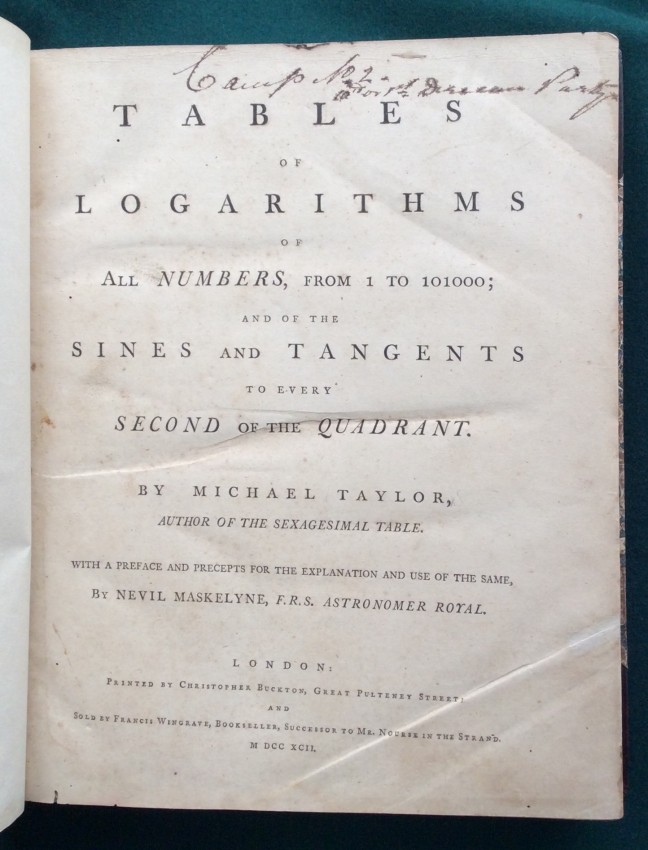OED: computer = a person who makes calculations (nb the movie ‘Hidden Figures’). Taylor was both a ‘computer’ for the Nautical Almanac, and a successful freelance computer, earning over £4000 from his table computations. Nevil Maskelyne had spotted Taylor's talent, and completed and published the present work on logarithms, sines and tangents after his death in 1789.