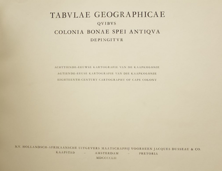 The publication contains, amongst others, the earliest map of the Colony, drawn by surveyor Wentzel in 1752, the 1762 map by surveyor Brink, the 1776 map by surveyor Cloete, the 1779 map by surveyor Leysten, Friderici's map of the South Coast (1789), the Hydrographical map of the south Coast by F. R. Duminy (1787), John Barrow's map of 1801, Lichtenstein's map of 1812, and a large fold-out general map of the Cape Colony by Governor C. J. de Graaff (1785).