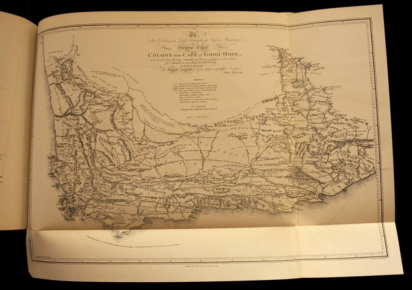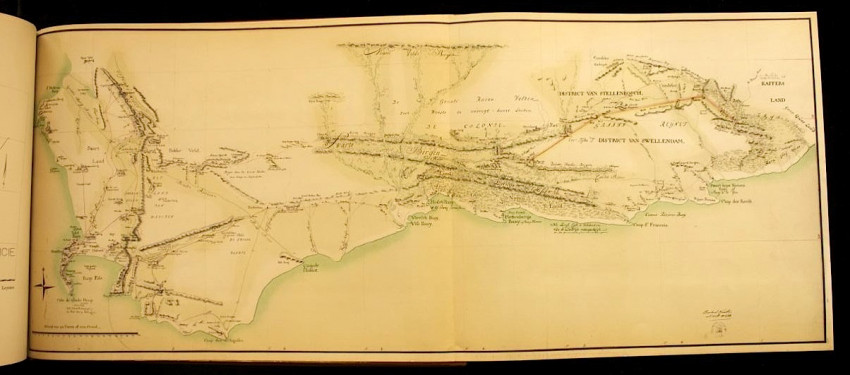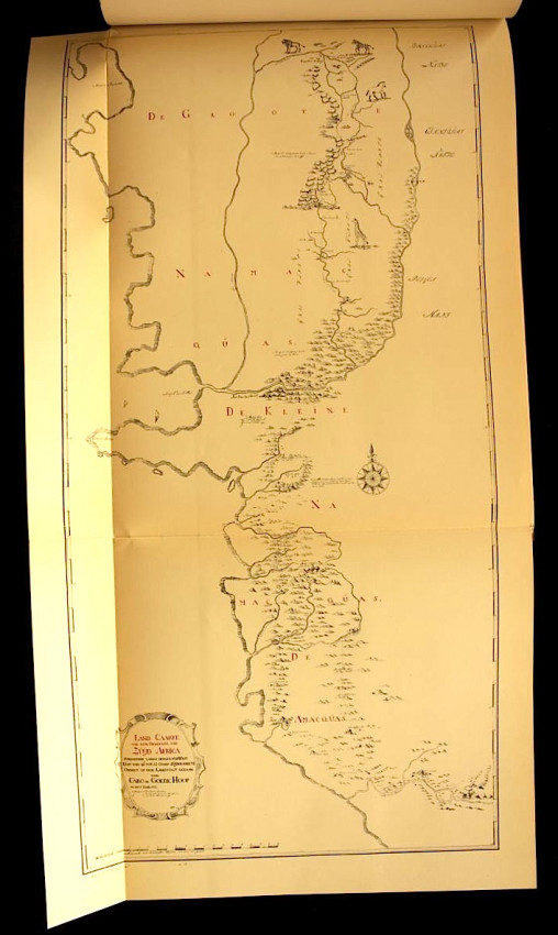 41pp of text in English, Afrikaans and Dutch, followed by 11 fold-out facsimiles of the earliest maps of the South African interior and 1 large folding map of the Cape Colony in the rear pocket.