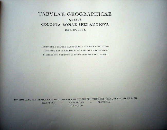 N.V.Hollandsch-Afrikaansche Uitgevers Maatschappij Voorheen Jacques Dusseau & Co., Amsterdam, dark red skivertex boards, text in Dutch, Afrikaanse and English., large fine fold-out maps in colour, maps by Wentzel, Ten Brink, Cloete, Friderici, Duminy, Barrow, Lichtenstein & van de Graaff. Maps fold-out to 700mm width 300mm height, loose map in back pocket is an exquisite Cape Colony Carte, 1500 x 590mm. 405 x 310mm, condition: very good.