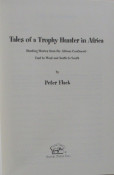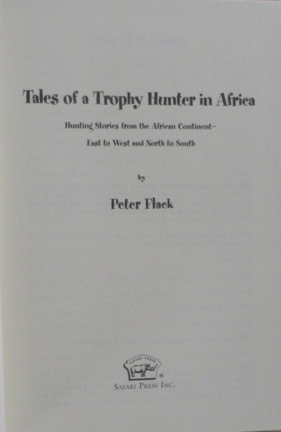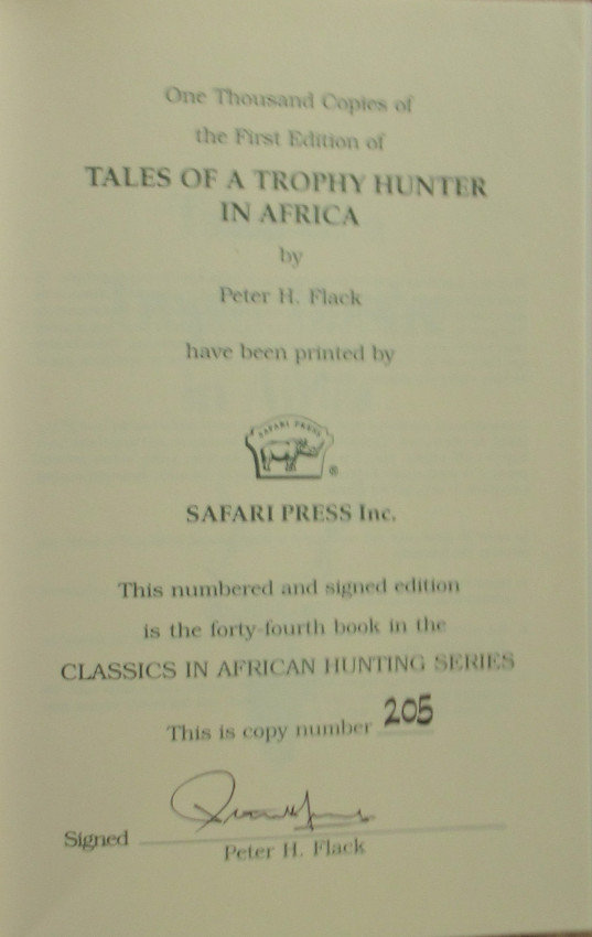 One Thousand Copies of the First Edition of Tales of a Trophy Hunter in Africa by Peter H.Flack have been printed by Safari Press Inc. This numbered and signed edition is the forty-fourth book i the Classics in African Hunting Series. This copy is number 205.