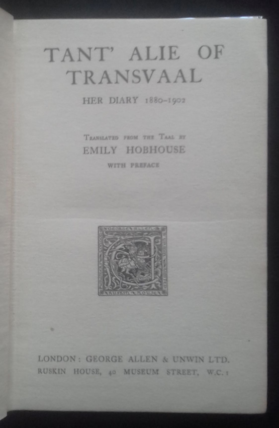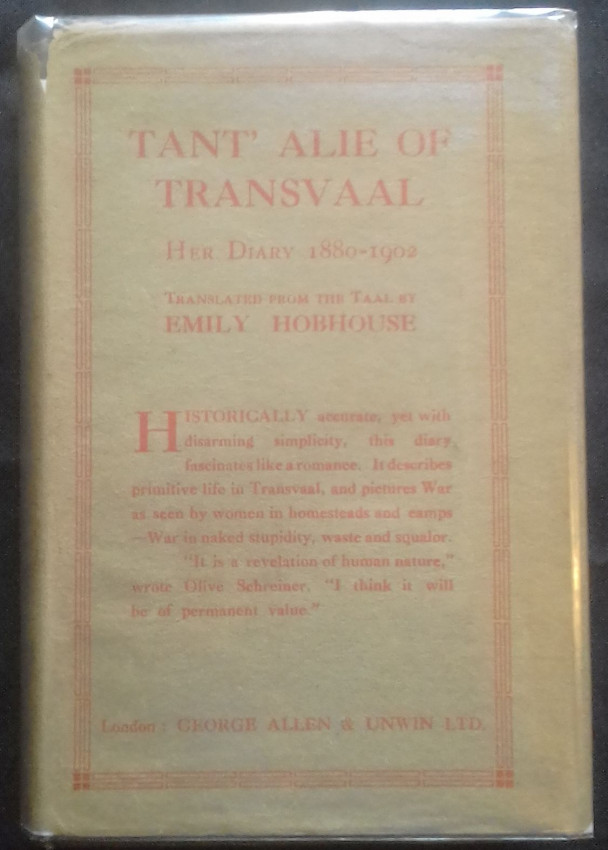 Diary of an Afrikaans woman called Tant' Alie, translated from 'the Taal' into English by Emily Hobhouse, famous for her humanitarian work in South Africa during the Boer War. Comes with the scarce dust jacket.
