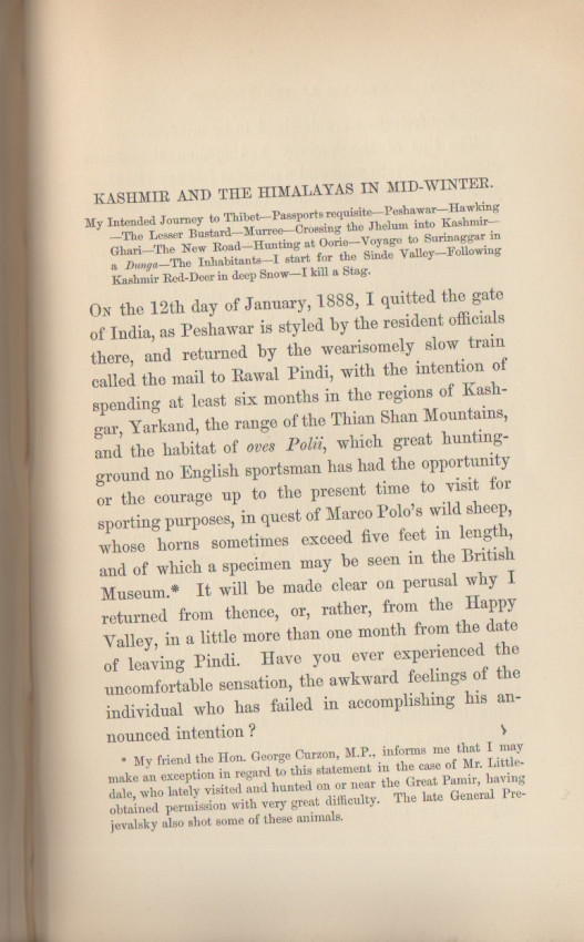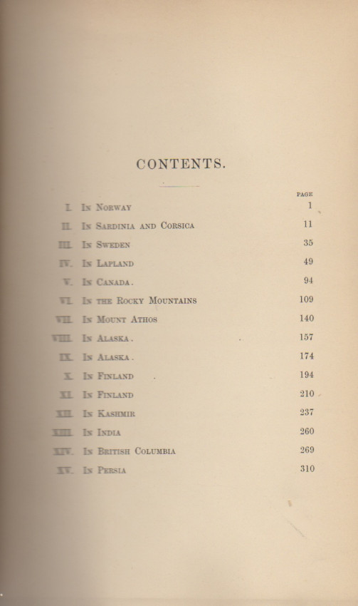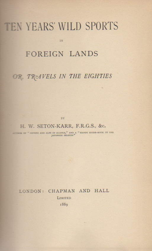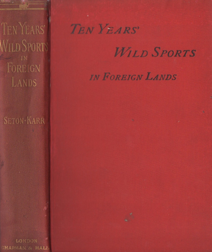 Seton-Karr was a famous sportsman who penned several books recounting his big game hunting experiences worldwide. In this work, he continues his adventures hunting reindeer in Norway, ibex in Corsica and Sardinia, fly-fishing for trout in Sweden and Finland, stalking mule deer in the Rockies, hunting mountain goats in the Cascades, etc. Of Asian interest are his chapters on hunting barasingh near Mt. Kotwal in Kashmir and antelope in India’s Bikaner region. Original red cloth with gilt spine titles. Spine head worn. Small nick to edge of front joint. Original black endpapers, inner hinges starting. This copy free of foxing.