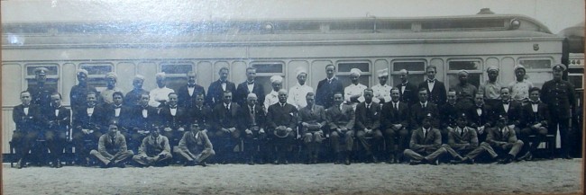 Original photograph of the staff and dignitaries of the Royal Party with the railway carriage. The Prince is center.