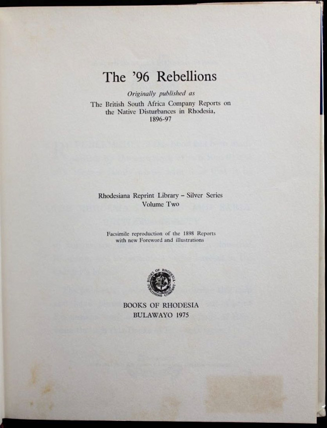 "The '96 Rebellions, originally published as The British South Africa Company Reports on the Native Disturbances in Rhodesia, 1896-97".