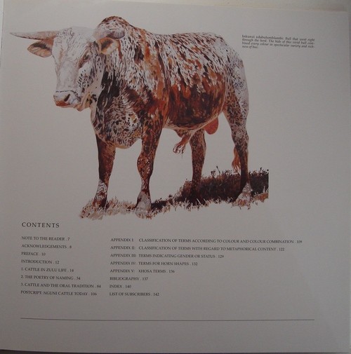 A work of art linked to the imaginative descriptions of Nguni cattle and their colour patterns and horn shapes, with examples, maps, diagrams and photographs to illustrate a detailed text. Different colours and patterns have symbolic and ritual significance, and different styles are more popular or important socially than others. This book describes in particular those pattern connected by name with birds, other animals, plants and natural phenomena.