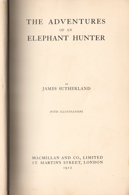 Czech: An annotated Bibliography of African Big Game hunting Books, 1785 to 1950, page 160, ‘One of the true classics of African big-game hunting, this work recounts the author’s elephant hunting exploits primarily along the Luwegu River in German East Africa, and the Loceringo River in Portuguese East Africa. In addition, there are encounters with rhinoceros, man-eating lion, leopard, and a variety of plains game. During one elephant stalk, Sutherland’s little terrier, Whiskey, survived being thrown into the bush by an enraged pachyderm.’