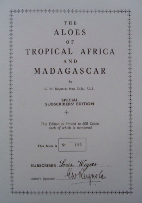 The standard work on African Aloes, outside of South Africa, and companion to Reynolds\' classic \"The Aloes of South Africa\" [see lot #207 on this auction for the SMUTS family copy]. This is copy no. 123 of the SPECIAL SUBSCRIBERS EDITION, limited to 600 specially bound copies, this copy belonged to Louis Weyers, grandson of Jan Smuts, with inscription by him on end-paper. Signed by the author. Hardcover. Dust jacket. Pp. xxii,537, numerous colour photo-plates, illustrations, maps. Dust jacket stained & a bit rubbed, some light browning.