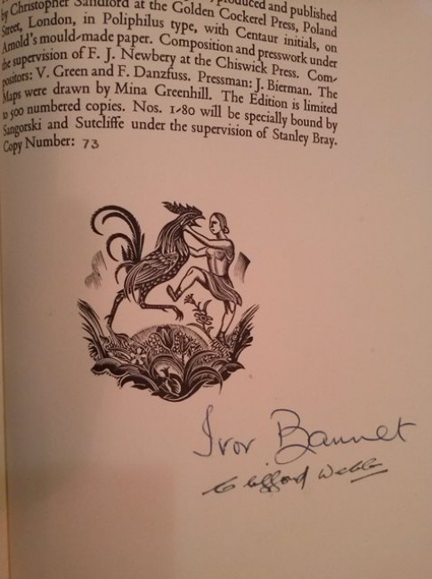The Amazons has been designed, produced and published by Christopher Sandford at the Golden Cockerel Press, Poland Street, London in Poliphilus type, with Centaur initials, on Arnold's mould-made paper. Composition and presswork under the supervision of F.J. Newbery at the Chiswick Press. Compositors: V. Green and F. Danzfuss. Pressman: J. Bierman. The maps were drawn by Mina Greenhill. The edition limited to 500 numbered copies. No. 1/80 are specially bound by Sangorski & Sutcliffe under the supervision of Stanley Bray.